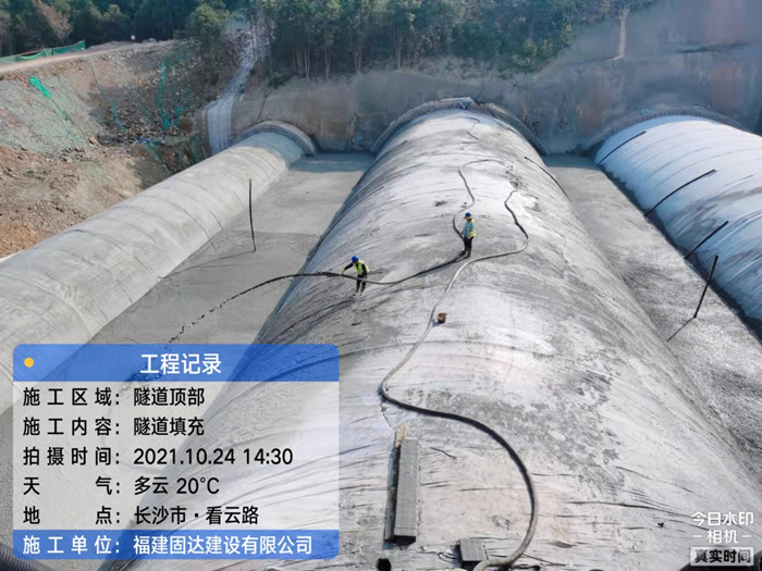 工程概况:长沙市夏鹃路下穿智慧公园隧道项目位于夏鹃路路段中段,雪松路以及龙柏路交叉口之间,下穿规划智慧公园现状山体。连拱隧道全长320米,双向八车道,隧道单个主洞开挖宽度18.9米,属特大跨,全断面开挖轮廓面积为186平方米。在隧道顶部将气泡混合轻质土做为回填材料,可大大减少荷载,控制沉降量,有效接推进相关管线及后续工程的顺利进行。