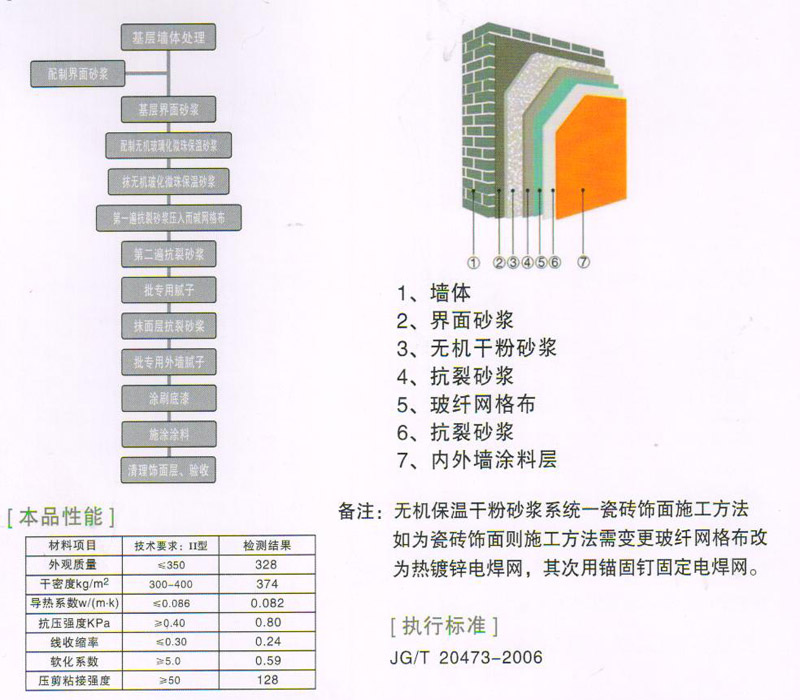 无机干粉保温砂浆是一种以玻化微珠为保温骨料,以高标号水泥各种分子干混而成的聚合物单组保温浆料,现场只需加水即可,材料燃烧性为A 级。